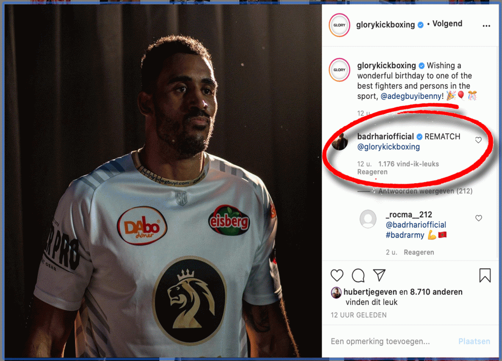 De reactie van Badr leverde maar liefst een paar honderd reacties van fans op. Die het wel zien zitten om hem nog eens tegen Adegbuyi in de ring te zien. In een post op zijn eigen Instagram liet Badr gisteren blijken zich te gaan voorbereiden op een gevecht. Of dit met Adegbuyi zal zijn ligt nu in handen van GLORY.