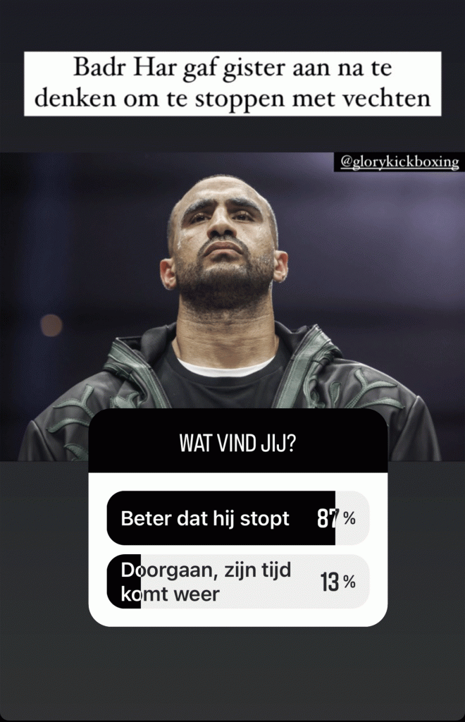 Opvallend is dat minder dan de helft van de vechters het wel welletjes vindt. "Badr liep dan wel tegen zijn zoveelste verlies aan bij Glory, toch blijft hij een van de beste kickboksers ter wereld", was een de reacties. Voor veel fans zou het een desillusie zijn als Badr stopt. De tijd zal het leren wat de beslissing wordt, stoppen of doorgaan.