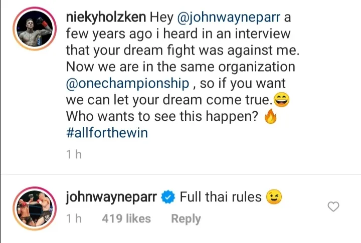 ONE Championship vechter Nieky Holzken, ziet een gevecht met Parr wel zitten. Sterker nog het blijkt dat de Australier die ook bij ONE op de loonlijst staat, een clash met Holzken als een droom gevecht ziet.