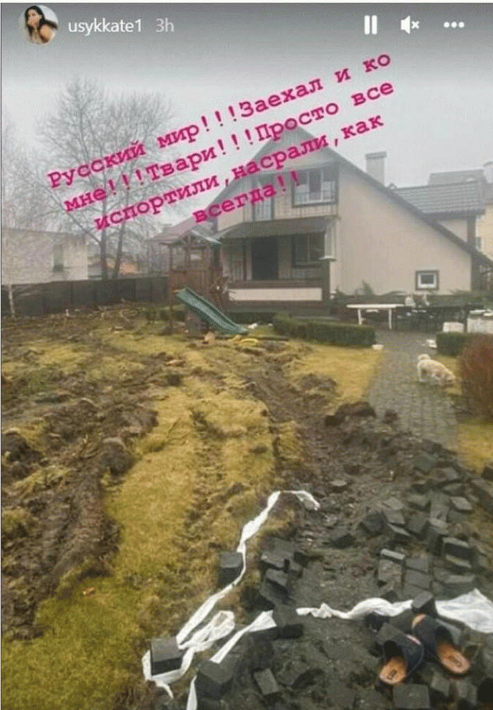 Usyk, Yekaterina, plaatste een afbeelding op sociale media van het huis dat er beschadigd uitzag terwijl Russische soldaten het bezetten en het als basis gebruikten.
