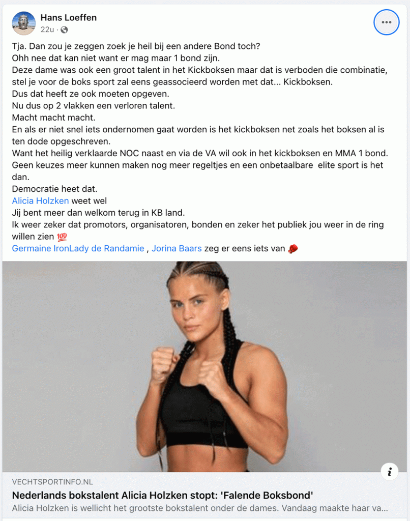 met een verklaring op haar site en vindt daarmee de zaak afgedaan. Echter blijft de ontevredenheid bestaan en is via social media te lezen dat er weerzin is tegen de behandeling van Holzken. Hans Loeffen de man achter de Nederlandse vechtsportbond WFCA en een van de meest ervaren bondsbestuurders van ons land, neemt het op voor Holzken.