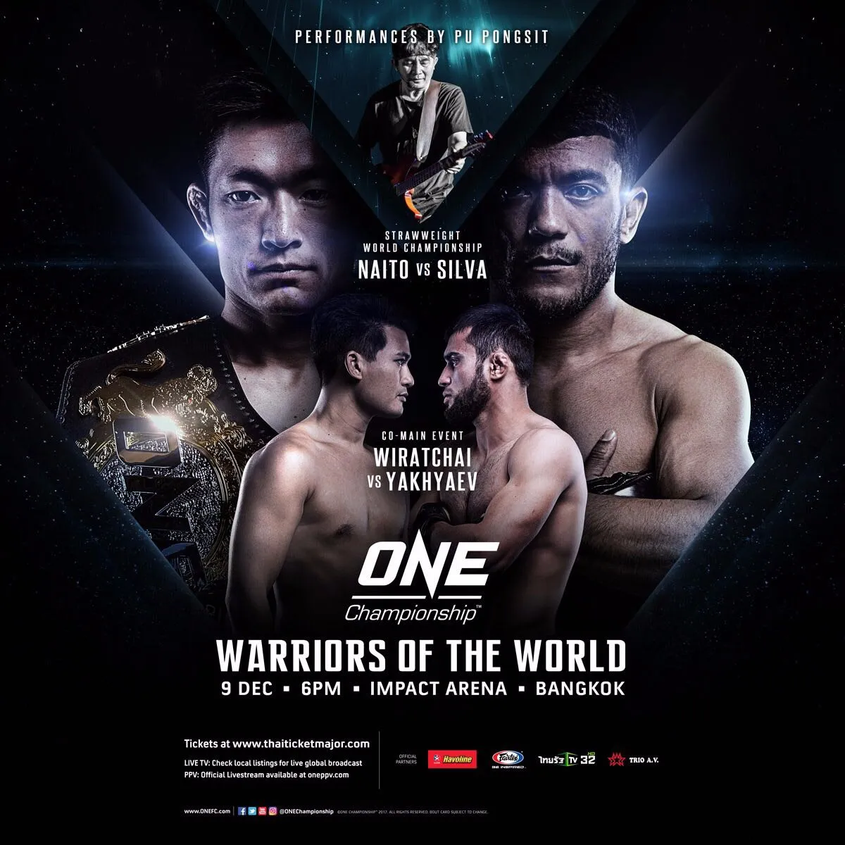 ONE Strawweight World Champion Yoshitaka "Nobita" Naito uit Chiba, Japan, is een ongeslagen in zijn professionele carrière met een perfecte 12-0 record. Hij bezit zes overwinningen door submission en één door knock-out. De 33-jarige, die naam maakte in de wereldberoemde Korakuen Hall in Japan, streed voor Shooto als haar vlieggewichtkampioen, veroverde het ONE Strawweight World Championship door Dejdamrong Sor Amnuaysirichoke in zijn promotiedebuut in 2016 te verslaan. Naito maakt de tweede verdediging van zijn riem tegen Alex Silva in Bangkok in december.