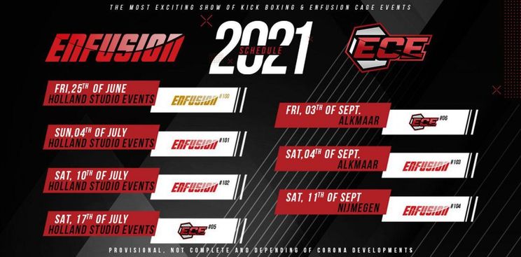 Enfusion komt met een aantal evenementen in ons land met een start op 25 juni tot in september. De Nederlandse top organisatie keert terug in een mix van studio evenementen en met publiek indien de corona situatie dit toelaat. De organisatie die bekend staat om haar spectaculaire evenementen met top vechters en kampioenen zoals Endy Semeleer en Levi Rigters, die inmiddels bij