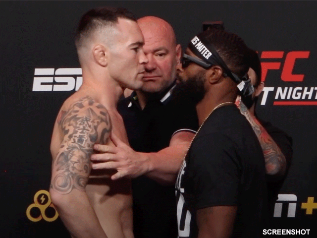 Op de vooravond van hun gevecht zijn de spanningen flink opgelopen tussen Colby Covington en Tyron Woodley. Beiden treffen elkaar zaterdagnacht. <--->