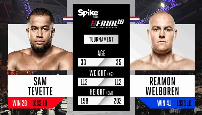 Stevige zwaargewicht partij met uitwisseling van stoten en trappen door zowel Tevette (33) als Welboren (35), twee lange vechters en Welboren blokte weinig van de lowkicks van Tevette die explosief vocht. Eerste ronde veel scores van Tevette vooral naar de benen van Welboren (die Andre Mannaart in zijn hoek had). De partij ging naar Sam Tevette door unanieme beslissing van de jury.
